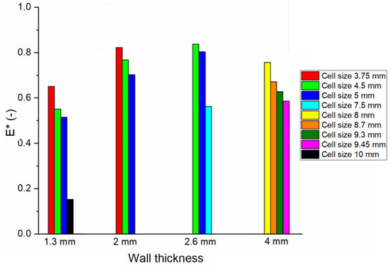 For the honeycomb structures, it was found that both cell size and wall thickness have an effect on the structure relative Young modulus, as shown in Figure 6. For designs with the same wall thickness, lower relative Young’s moduli were computed for larger honeycomb cell sizes. On the contrary, increasing wall thickness while maintaining the same cell size led to an increase in the sample relative Young modulus.