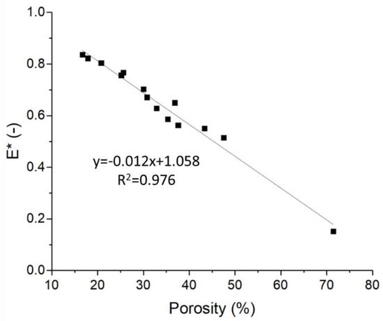 Values of the relative Young’s modulus with respect to the sample porosity. An inverse linear dependence on porosity can be observed, regardless of the sample wall thickness and cell size.