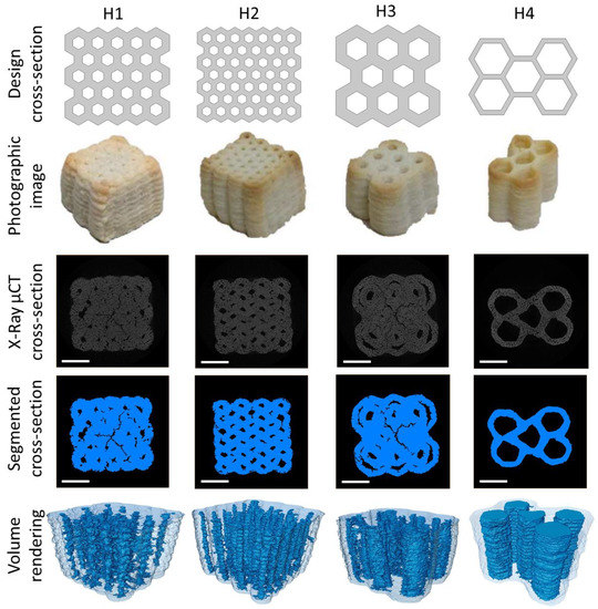 From the µCT images (Figure 8), the presence of cracks that occurred in some samples during the baking process can be noticed. These cracks show an anisotropic orientation and might influence the structure stability and Young modulus. Moreover, detachment of the wall following baking can be observed for sample H3 as a consequence of the use of a too small nozzle, requiring construction of this design based on double walls. An increased wall thickness with respect to the original design can be observed in the µCT images, as a consequence of the spreading of cookie dough during printing and of the baking process. This geometry modification clearly led to a pore size reduction and ultimately to a lower measured porosity. From the µCT images, it can also be noticed how the 3D printed samples had a more rounded geometry than the original honeycomb structure design, with a reduction in the sharpness of the geometry edges.