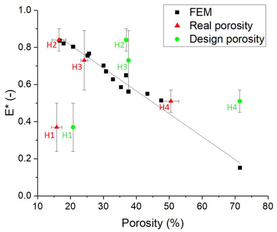 Comparison of the relative Young’s modulus of the 3D printed cookie honeycomb structures obtained from experimental tests and from FEM. Experimental results are reported as function of the design porosity (green circles) and of the measured porosity (red triangles).
