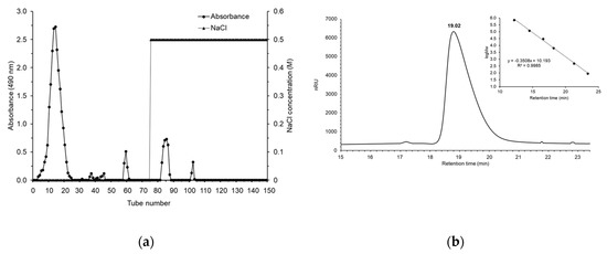 Elution curve obtained using Sephadex G-75 gel filtration (a) and HPLC chromatograms (b).