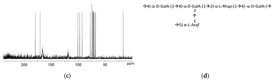 The 1H and 13C NMR spectra, illustrated in Figure 2b,c, confirmed the attribution and structural characterization of MESP. Based on the data in existing literature, the signal of five anomeric protons at δ3.18–4.18 was identified as the zone of accumulation of protons from α-D-GalA- residues, whereas that at δ1.21–4.03 was assigned to α-L-Rhap- [8]. The 13C NMR spectrum of MESP showed no signal at low field from 160 to 180 ppm, indicating that MESP did not contain uronic acid. Chemical shifts of MESP are summarized in Table 2. According to the corresponding chemical shifts in existing literature, MESP structure was proposed, as shown in Figure 2d.