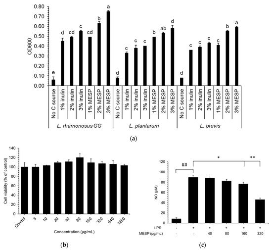 Growth of probiotics in glucose free-MRS base media with supplement of inulin or MESP (a). OD600, optical density of a sample measured at a wavelength of 600 nm. Values are expressed as mean ± SD (n = 3). Different letters indicate significant (p < 0.05) differences in the same strain. Cytotoxic effects (b) and NO production (c) of MESP in RAW 264.7 cells. ## p < 0.01, compared to the control group; * p < 0.05, ** p < 0.01, compared to the lipopolysaccharide (LPS) treated group.