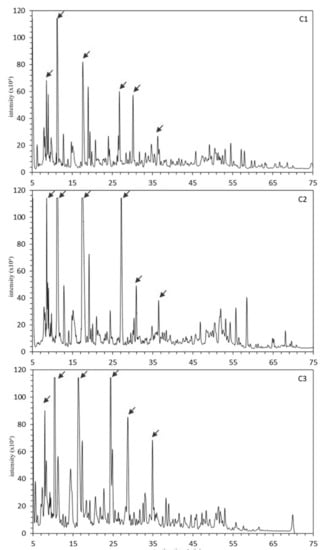 The reverse-phase high-performance liquid chromatograms (RP-HPLC) of ultrafiltrates (NMWL 3000) of three fermented Bactrian camel’s milks obtained from different herders (C1–C3). Arrows indicate fractions manually collected for MS/MS peptide identification. The peak IDs were given in accordance with their retention time, e.g., the arrow indicating the left-most peak’s ID in C3 is C3–1.