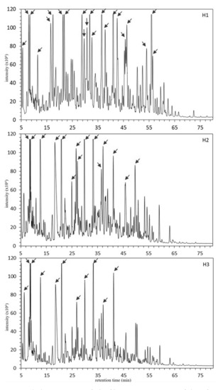The RP-HPLC chromatograms of ultrafiltrates (NMWL 3000) of three fermented mare’s milks obtained from different herders. Arrows indicate fractions manually collected for MS/MS peptide identification. Arrows indicate fractions manually collected for MS/MS peptide identification. The peak IDs were given in accordance with their retention time, e.g., the arrow indicating the left-most peak’s ID in H1 is H1–1.