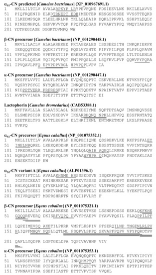 In this study, 11 and 24 peptides were identified in the fermented camel’s milk C3 and the fermented mare’s milk H1, respectively. A high number of unidentified peptides could arise from presence of unknown post-translational modifications in their mother proteins. Peptides originated from caseins were dominant in both C3 and H1. Especially, a variety of β-CN-derived peptides accounted for the majority of the identified peptides due to the high abundance of β-CN (45–65% of total caseins) in camel or mare milks [14,33]. The most specific feature of peptides found in the fermented camel’s milk C3 was the presence of κ-CN- and lactophorin-derived peptides (Figure 1 and Table 1). The κ-CN-derived peptide, R110PRPRPS116, could be aligned using protein BLAST with a C-terminal region of bovine para-κ-CN HPHPHLS, which is known to be produced by chymosin treatment during cheese manufacturing [34]. This part of camel’s κ-CN is in the proximity of the chymosin cleavage site [35]. To date, no health-promoting effect has been reported for this peptide, in contrast to glycomacropeptide, which is the counterpart to the para-κ-CN in the chymosin hydrolysate of κ-CN. Bovine lactophorin and its N- and C-terminal truncated variant (f3-135) are known as proteose-peptone component 5 [36] and GlyCAM-1 [37], respectively. On the other hand, the lactophorin-derived peptides, R75RHQNQNPK83 and R76HQNQNPK83, found in this study were embedded in the middle part of mature lactophorin. Ibrahim et al. [38] recently found two lactophorin-derived peptides, E113NTMRETMDFLKSLF127 and A79TTLEGKLVEL89, in pepsin-digested camel milk whey hydrolysates that confer tolerance against H2O2-induced oxidative stress to yeast cells. The biological significance of the lactophorin-derived peptides found in the fermented camel’s milk in this study remains to be elucidated. One α2-CN-derived peptide, K16HNMEHR22, was characteristically found in fermented mare’s milk H1, but its bioactivity also remains unclear.
