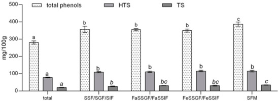 Results presented in Figure 1 show that bioaccessibility of total phenols, HTS and TS is slightly but significantly increased during gastrointestinal digestion, due to liberation of polyphenolic compounds from complex food matrix (281.0 to 357.5 mg/100g; 78.4 to 109.3 mg/100g; and 20.7 to 27.4 mg/100g, respectively). This is consistent with available literature data stating that during the gastric phase of digestion the majority of polyphenols is released from food matrix where they originally formed covalent bonds with carbohydrates of the cell wall, proteins, or one with another [10]. Our previous investigation that focused on the impact of cyclodextrin encapsulation on bioaccessibility of HTS and TS also showed that both, HTS and TS are stable in the gastrointestinal tract, and that their concentrations remain the same or increase during gastrointestinal digestion [8].