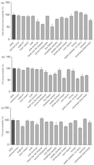 Impact of different foods on relative bioaccessibility* of total polyphenols (a), HTS) (b) and TS (c) from OPE. * Relative bioaccessibility was calculated in relation to in vitro bioaccessibility of total phenols, HTS, and TS from OPE obtained after simulation of gastrointestinal digestion using FaSSIF/FeSSIF. Columns marked with * differ significantly from OPE (p ≤ 0.05). OPE—olive pomace extract; FaSSGF—fasted state simulated gastric fluid; FaSSIF—fasted state simulated intestinal fluid; HTS—hydroxytyrosol; TS—tyrosol.