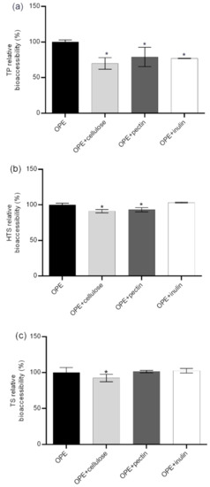 Impact of cellulose, pectin and inulin on relative bioaccessibility* of TP, HTS, and TS from OPE. * Relative bioaccessibility was calculated in relation to in vitro bioaccessibility of TP, HTS, and TS from OPE obtained after simulation of gastrointestinal digestion using FaSSIF/FeSSIF. Columns marked with * differ significantly from OPE (p ≤ 0.05). OPE—olive pomace extract; FaSSGF—fasted state simulated gastric fluid; FaSSIF—fasted state simulated intestinal fluid; TP—total phenols; HTS—hydroxytyrosol; TS—tyrosol.