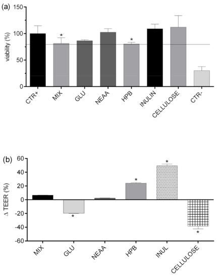 Viability (%) of Caco-2 cell monolayer determined by MTT test after exposure to analyzed food fractions (a). Relative change (%) of TEER values during the experiment (b). positive control (CTR+)—HBSS; MIX—TS + HTS (40 mg/L); EDTA (10μM); GLU—glucose (10 mM); NEAA—non-essential amino acids (0.25%); HPB—hydroxypropyl beta-cyclodextrin (2.4 g/L); CELLULOSE—cellulose (1%); INULIN—inulin (1%); CTR—tBOOH (350 µM); TEER—transepithelial electrical resistance. Columns marked with * differ significantly from the reference column: (CTR+ (a); MIX (b)).