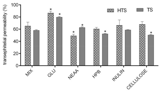 Permeability (%) of HTS and TS in Caco-2 cell monolayer (the amount of TS/HTS in basolateral compartment was expressed as the percentage of the amount applied to Caco-2 cell monolayer). MIX-TS + HTS (40 mg/L); GLU—glucose (10 mM); NEAA—non-essential amino acids (0.25%); HPB—hydroxypropyl beta-cyclodextrin (2.4 g/L); APPLE FIBRE—apple fiber (1%); INULIN (1%). Columns belonging to the same series marked with * differ significantly (p ≤ 0.05) from the reference column (MIX).