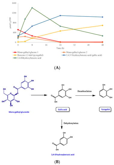After an incubation time of 4 h, significant quantities of pyrogallol (40 µmol/g DW), gallic acid (410 µmol/g DW) and 3,4-dihydroxybenzoic acid (949 µmol/g DW) were detected, attaining the highest accumulation of these compounds after incubation periods of 48, 24 and 8 h, respectively (176–691 µmol/g DW, 662–1033 µmol/g DW and 1410–267 µmol/g DW). A concomitant decrease to almost zero of the mono-galloyl-glucosides and hydroxybenzoic acid-hexosides was also evidenced after 48 h of incubation (Table 4, Figure 1A). These data indicate that a plausible mechanism for galloyl-glucoside degradation by human microbiota is, first, the microbial-mediated transformation of mono-galloyl-glucoside into gallic acid, as the first catabolic event, which is further decarboxylated or dehydroxylated producing pyrogallol and 3,4-dihydroxybenzoic acid, as proposed in Figure 1B. In line with our results, Hernandez-Maldonado et al. [20] reported that gallic acid was identified during the in vitro fermentation of digested mango bars, the maximum amount being reached after 6 h of incubation. Moreover, gallic acid has been identified in human urine after mango pulp consumption [39,40] and was inversely correlated with the urinary excretion of pyrogallol, indicating the colonic origin of this catabolite.