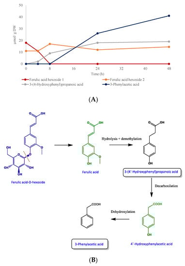 These catabolites were arguably formed by the degradation of ferulic acid-hexoside via hydrolysis and the demethylation of ferulic acid to 3-(4-hydroxyphenyl)propanoic acid, and further decarboxylation and dihydroxylation to 3-phenylacetic acid following the procedure described in Figure 2B. Indeed, these catabolites have been reported to be faecal fermentation products of ferulic acid [25].