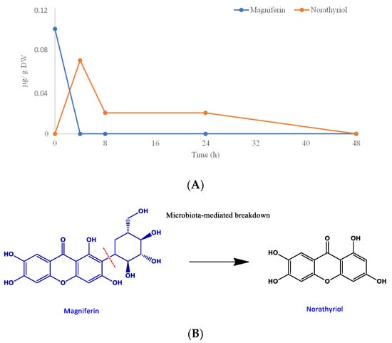 The incubation of faecal slurries with the digested mango polyphenols also resulted in the appearance of norathyriol after 4 h of incubation (0.07 µmol/g DW), the levels decreasing slightly during the fermentation process until disappearing after 48 h of incubation (Table 4, Figure 3A). This compound has been described as the main microbial-degradation product of mangiferin, in which faecal bacteria act by cleaving the C-glycosyl bond leading to aglycone [42,43] via the pathway illustrated in Figure 3B. The Bacteroides species named MANG, found in human faeces, is reported to be responsible for this transformation [44]. In view of these results, the catabolite norathyriol can be proposed as a biomarker of the colonic degradation of mangiferin.