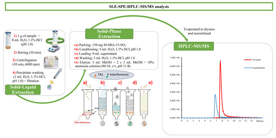 Approximately 1 g of sample was weighed in a 50 mL Falcon tube with an accuracy of 0.0001 g and 8 mL of water acidified with 1.1% HCl (pH 1.0) were added. The mixture was stirred for 30 min at room temperature and then was centrifuged with a Rotofix 32A centrifuge (Hettich, Germany) at 6000 rpm for 10 min. The supernatant was recovered and the precipitate was washed with 1 mL H2O, 1.1% HCl (pH 1.0). The supernatant obtained was mixed with the previous one and filtered through a 0.45 µm nylon filter, prior to the purification step by the SPE procedure. Empty cartridges were packed with 150 mg of M-SBA-15-SO3− material and plugged with frits of polyethylene at both ends. A nylon membrane (0.45 µm pore size) was also inserted at the bottom of the sorbent bed to prevent the loss of material during the sample loading. Cartridges were preconditioned with 5 mL of acidified aqueous solution (1.1% HCl, pH 1.0) at a flow rate of 1 mL/min. Once the supernatant was loaded, cartridges were dried with a Scharlab ExtraVac® solid extraction vacuum manifold 12 port (Scharlab, Barcelona) connected to a vacuum pump at 10 psi, and then washed with 3 mL water acidified with 1.1% HCl (pH 1.0) to remove interferences. Then, the cartridge was dried for 1 min. Finally, the target analytes were eluted with 3 mL of MeOH followed by 2 × 3 mL MeOH containing 10% of ammonia solution (pH 11.8). During elution, the first drops were allowed to pass through the cartridge in each elution and the valve was closed for 5 min. Eluates were evaporated to dryness and redissolved with 500 µL of ACN/H2O (50:50, v/v) for analysis in the chromatography system (Figure 1).