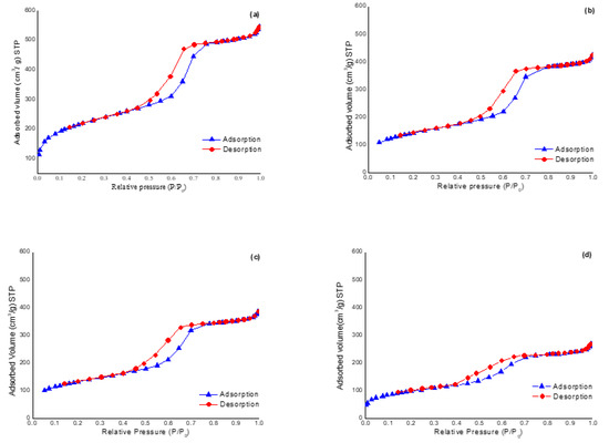 N2 adsorption-desorption isotherms of the following materials: (a) SBA-15, (b) L-SBA-15-SO3−, (c) M-SBA-15-SO3− and (d) H-SBA-15-SO3−.