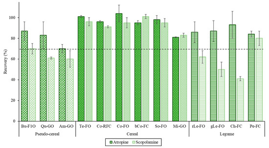 The mean recovery values ranged from 93 to 105% (Table S5). On the other hand, as it can be seen in Figure 4, in quinoa amaranth, lentil and chickpea samples spiked at the higher level (100 µg/kg) recoveries lower than 70% were observed for scopolamine. However, this compound could be quantified in these samples using a correction factor, as according to SANTE/11813/2017 document the recoveries between 30 and 70% and 120 and 140% can be acceptable if RSD is ≤20%. These results indicated that the method could be used in these other foods, after confirming the recoveries at the medium and lowest spiking levels. Recoveries obtained in this work were comparable or better (at low concentrations) with those obtained by other authors in previous studies for atropine and scopolamine in grains, flours and related products (50–109%) [17,18,27,28], but the use of internal standards was avoided [15] and lower ME were observed because of the sample extraction procedure applied.