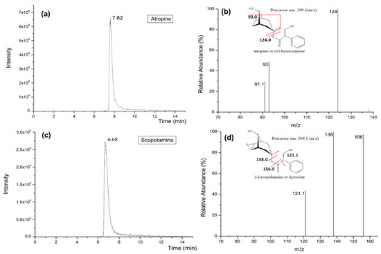 Figure 5 shows the mass spectrum obtained after optimization of the detection. Different fragments were found using ESI in positive mode. The most common ruptures of TAs are generally produced in the tropane ring. These ruptures generate a characteristic product ion in the case of atropine m/z 124.0 and m/z 138.0 for scopolamine. Another common ion fragment in the case of atropine is m/z 93.0, which is formed by the rupture of the ester and the nitrogen of the tropane ring. Two mobile phases were tested, using 0.1% HCOOH in ACN or 0.1% HCOOH in MeOH as eluent A. In both cases, eluent B was 0.1% HCOOH in Milli-Q water. The best results were obtained using ACN as organic solvent, obtaining good separation and better peak intensity. With this mobile phase, the tr for atropine and scopolamine was found to be 7.62 and 6.68 min, respectively (Figure 5).