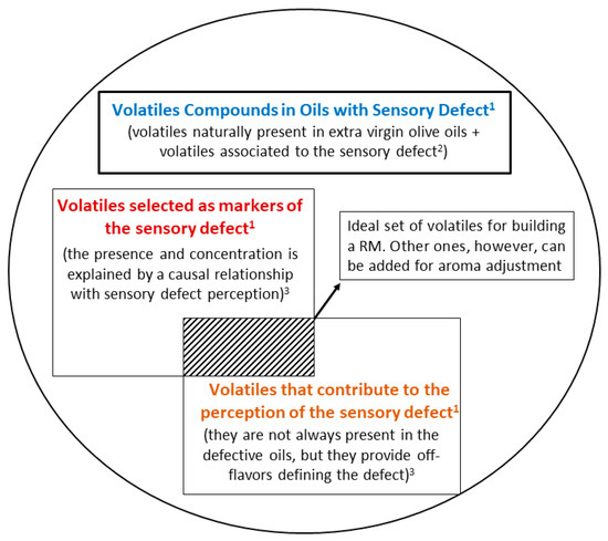 Figure 1 shows the scheme of the strategy used. The volatile compounds that are suitable to formulate the RMs are those resulting from the overlap between two subgroups of volatile compounds: sensory markers of the defect (subgroup 1), though not all can contribute to the sensory perception, and those that can contribute to the aroma of the sensory defect (subgroup 2), even if not all contribute exclusively to it or are always identified in oils with the corresponding sensory defect. In other words, the compounds that lie in the overlap of these two subgroups are those that provide aromas that are highly representative of the off-flavor of the sensory defect, regardless whether they are always present in natural VOOs with the defect.