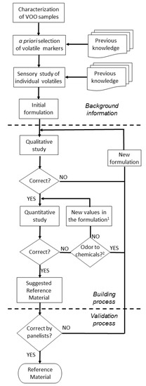Flow diagram for formulating RMs. Note: 1 reformulation includes selection/removal of compounds and/or new adjustment of concentrations; 2 the question refers to perception of a “chemical” aroma that is far from the natural off-flavors found in VOO.