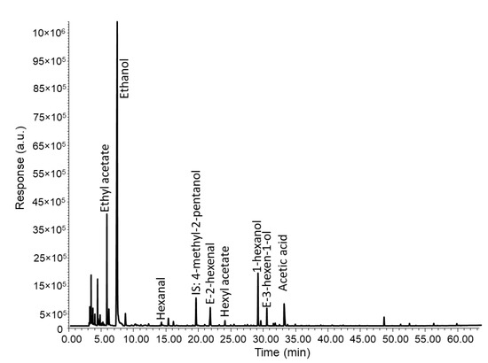 As a first step, the chromatograms of oils with winey-vinegary defect were examined to identify the most relevant volatile compounds. Figure 3 shows the chromatogram of a VOO that was qualified with a medium-high intensity (Md = 5.7) of vinegary-winey defect by sensory laboratories. There were 7 major and most characteristic volatiles, although only three (ethyl acetate, ethanol and acetic acid) explain the vinegary-winey defect. These volatiles were selected as “primary compounds” for this sensory defect since they smell sticky, alcohol/spicy/winey, and vinegary, respectively [40]. The other four (hexanal, E-2-hexenal, 1-hexanol, E-3-hexen-1-ol) contribute to cut grass/green sensory perception, a perception that is present in all VOOs at different levels of intensity.