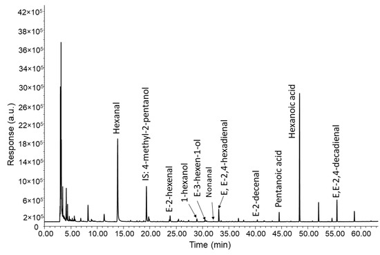 As a second approach to reformulate R1, a search for new compounds providing rancid aroma was carried out. Figure 4 shows the chromatogram of a VOO qualified with an intensity of rancid perception at Md = 9.5. The chromatogram shows that there are four other compounds (E,E-2,4-hexadienal, E,E-2,4-decadienal, E-2-decenal and hexanoic acid) that contribute to rancid perception without the problems of the aldehydes as already pointed out and led to a major consensus in sensory evaluation by assessors.