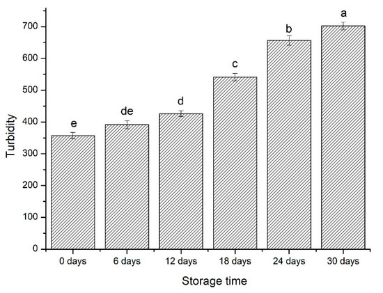 Turbidity of SPI (mmol∙mg−1) with different storage times. Different letters (a, b, c, d, e) indicate significant differences (p < 0.05).