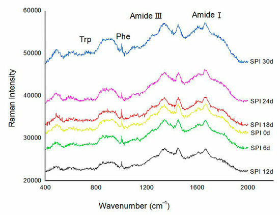 The 10 g of samples of SPI at different storage periods were solubilized 100 mL of deionized water at a concentration of 100 mg/mL for Raman spectroscopy analysis. The Raman spectroscopy analysis was determined according to the method of Zhu et al. [16], using PerkinElmer Raman Station 400 F dispersive Raman spectrometer equipped with a 785 nm diode laser under 80 mW of laser power. The laser was focused on the samples on glass slides. For each sample, the spectrum measurement with 60 s exposure time was repeated 10 times scan for each sample under 2 cm−1 resolution, and the spectral range was set to 400~2000 cm−1. Each sample was scanned three times, and the average spectrum was used for a representative spectrum for each sample.