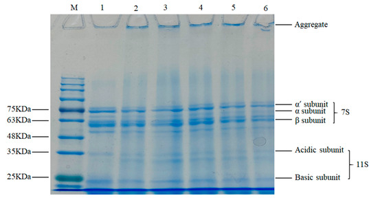 The typical SDS–PAGE profile of SPIs are shown in Figure 3. The major components of SPI were β-conglycinin (7S) with α’ subunit (MW 83–57 kDa), α subunit (MW 76–57 kDa), β subunit (MW 53–42 kDa), and globulins glycinin (11S) with acidic subunit (MW 40–37 kDa) and basic subunit (19–20 kDa) [37]. According to Figure 3, the band intensities of SPIs gradually decreased with storage time, especially the α’ subunit, α subunit of 7S and the basic subunit of 11S bands were gradually lighter. It indicated that protein oxidation promoted aggregation between the subunits of 7S and 11S. Meanwhile, the long-term storage resulted in the formation of insoluble crosslinking high molecular of protein aggregate (Figure 3), which prevented them from entering the electrophoretic gel [37]. Kong and Chang [38] already observed that a consequence of soy protein storage is the formation of extensive protein aggregates, which could not penetrate into the acrylamide gel.