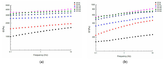 The typical frequency sweep plots for Chiba tofu in different storage periods are shown in Figure 4. The G′ was higher than G′′, indicating that there was a continuous network structure in Chiba tofu. It has been reported that the faster molecular mobility of solid particles was connected with the frequency-dependent property of G′ and G″ [39]. Both G′ and G′′ slightly increased as the increasing frequency of oscillating stress, which demonstrated that the characteristic of the Chiba tofu prepared in this study was close to a viscoelastic material [40]. The G′ and G′′ first increased and latterly slightly decreased with storage periods. As a result of oxidation, soluble protein aggregates during storage, and this could result in a great extent of crosslinks and lead to thicker strands and denser network structures with higher storage and loss moduli [41]. However, severe oxidation in further stages resulted in the formation of a discontinuous network of Chiba tofu (Figure 5) and therefore had an adverse effect on the quality of Chiba tofu.
