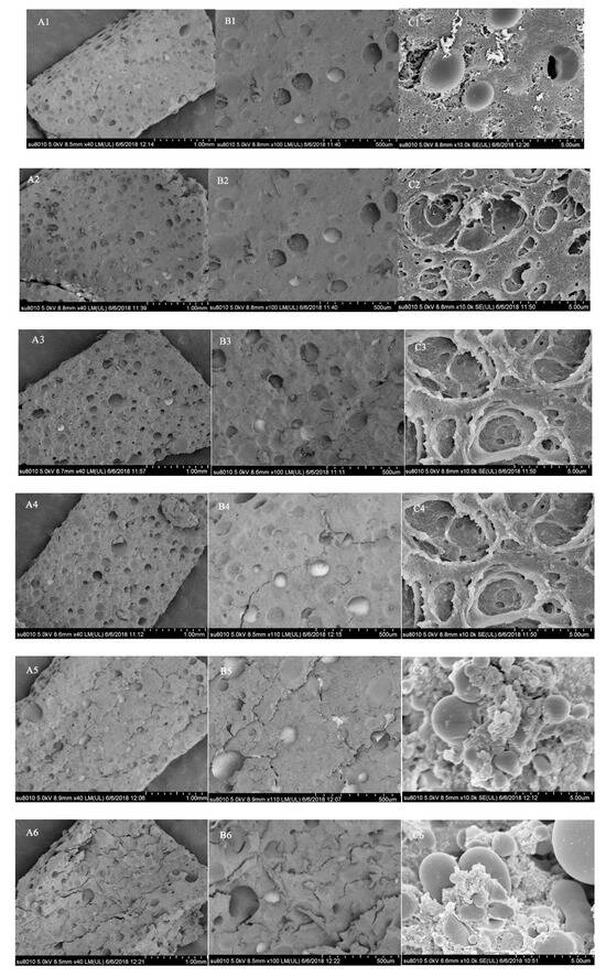 Scanning electron microscope of the Chiba tofu. Numbers 1, 2, 3, 4, 5 and 6 represent the samples of SPI that were stored for 0 days, 6 days, 12 days, 18 days, 24 days and 30 days, respectively. (A1–A6,B1–B6,C1–C6) represent the magnification of 40, 100 and 10,000.