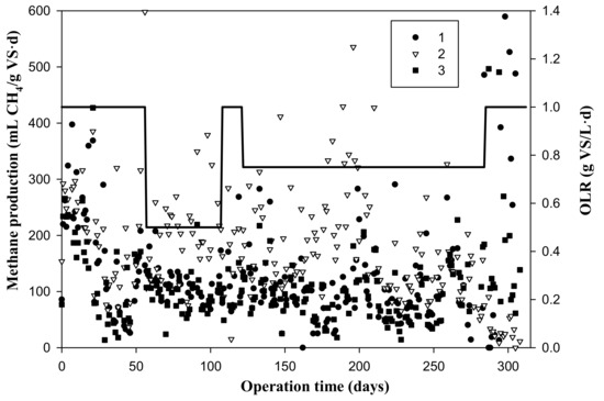 3.1. Methane Production Rate at Different Organic Loading Rates throughout the Experimental Period