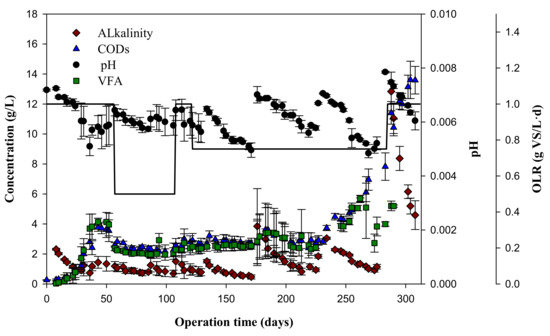 Variation of pH (●), alkalinity (♦), CODs (▲), and VFA (■) values, with their standard deviations, throughout the experimental period for the different organic loading rates (OLRs, bold line) assayed.