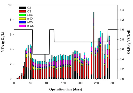 The individual VFAs are shown in Figure 3. These were determined two times per week and are expressed in mg of O2/L. In Stage 1, i.e., 0–56 days and OLR = 1 g of VS/(L·d), C2 and C3 increased to values up to 1500 mg of O2/L, n-C4 and n-C5 increased to values up to 600 mg of O2/L, and i-C4 and i-C5 were also augmented to values up to 150 mg of O2/L. In Stage 2, i.e., 57–107 days and OLR = 0.5 g of VS/(L·d), individual VFAs can also be observed, although the process was much more stable, showing a mean C3 value of 1298 ± 211 mg of O2/L and C2, n-C4, i-C4, n-C5, and i-C5 concentrations below 500 mg of O2/L. In Stage 3, i.e., 108–121 days, it was decided again to raise the OLR to 1 g of VS/(L·d) since in Stage 2, the reactor was stabilized. The individual VFAs in Stage 3 presented a mean C3 value of 1306 ± 65 mg of O2/L, and a mean n-C5 value of 444 ± 90 mg of O2/L, with C2, n-C4, i-C4, and i-C5 below 500 mg of O2/L. In Stage 4, i.e., 122–284 days and OLR = 0.75 g of VS/(L·d), the individual VFAs presented a mean C3 value of 2189 ± 1551 mg of O2/L, and mean n-C5 value of 760 ± 1243 mg of O2/L, with C2, n-C4, i-C4, and i-C5 below 500 mg of O2/L.