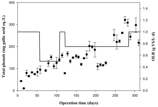 Variation of the total phenol concentrations, with their standard deviations, with the organic loading rate (OLR, bold line) throughout the experimental time.