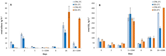 Ethylene production (A) and CO2 production (B) during cold storage periods (2 and 8 °C) and complimentary commercialization simulations (COM; 4 days at 22 °C) for flat peach samples with or without active paper sheets (including βcyclodextrin (CD)-encapsulated essential oils (EOs)) (n = 3 ± SD).