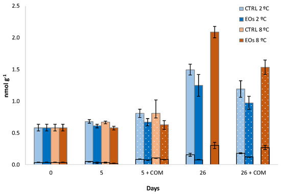 MACC and free ACC (black squared bars) contents during cold storage periods (2 and 8 °C) and complimentary commercialization simulations (COM; 4 days at 22 °C) for flat peaches with or without active paper sheets (including βCD-encapsulated EOs) (n = 3 ± SD).