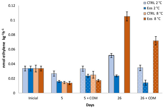 Packaging treatment and packaging treatment×storage temperature interaction were significant for ethylene production (Table 1), with samples stored with active EO sheets showing lower values than CTRL samples (Figure 1). In particular, samples stored with active EO sheets exhibited up to 32% and 70% lower ethylene production than samples with CTRL sheets after 26 days at 2 °C and after the corresponding commercialization period, respectively. The beneficial effect of EOs released from the active sheets were not able to be observed due to the the low ethylene production of samples at 8 °C after >26 days. Nevertheless, the supposed high ethylene production of CTRL samples stored for ≥26 days might suggest an inhibitory effect of released EOs against ethylene production in flat peaches. It has been demonstrated that EOs inhibited ethylene biosynthesis in several fruits and vegetables, although the mechanism behind this was not deeply studied regarding the key components (ACC, MACC, and ACO) of the ethylene biosynthesis pathway [12,42,43,44]. A similar trend was observed for CO2 production, probably owing to downregulated metabolism due to EO-induced ethylene inhibition. This hypothesis is reinforced according to the key components of the ethylene biosynthesis pathway—ACC and ACO, as explained in the following lines.