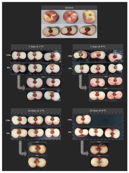 Flat peach flesh may show color alterations related to physiological disorders at cold storage temperatures, such as flesh browning or flesh reddening. Flesh browning is due to oxidation of phenolic compounds by PPO enzymes, while flesh reddening in flat peaches may be linked to tissue senescence (leading to tissue disruption close to the skin and anthocyanin migration to the flesh) or a phenolic (anthocyanins) biosynthesis response to abiotic stresses, such as long, cold storage periods [1,52,53]. No visual flesh browning or remarkable flesh reddening was observed after 5 days of storage (Figure 4). However, mild flesh browning (in mesocarp regions close to the skin) was observed after 26 days, especially in samples stored at 8 °C, with lower incidence in samples with active EO sheets (Figure 4). Flesh browning in samples stored for 26 days was more evident after the subsequent commercialization period, with lower incidence in EOs samples at 2 °C, while CTRL and EOs samples stored at 8 °C showed very poor flesh quality with evident mealiness. Flesh reddening was observed after commercialization of samples cold-stored for 5 days, which might be explained by anthocyanin accumulation (see Section 3.6), as previously reported [52]. Nevertheless, such flesh reddening was not observed after the commercialization of samples stored for 26 days, probably owing to phenolic oxidation due to higher PPO activity (see Section 3.6).