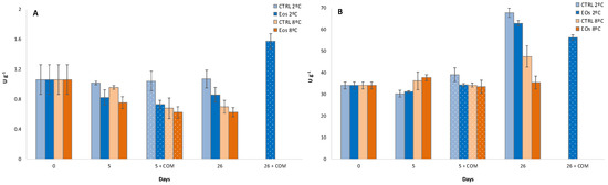 Similar to endo-PG, storage temperature, packaging treatment, and storage time factors were significant for exo-PG activity (Table 1). Storage temperature × time and packaging treatment × time interactions were also significant for exo-PG activity. Nevertheless, exo-PG did not show high activity changes (<7 U) after 5 days of storage or the subsequent commercialization period. Nevertheless, sharp increases of exo-PG activity of 99 and 40% were observed after 26 days of storage at 2 and 8 °C, respectively. The observed higher pectolytic activity at 2 °C was in accordance with the observed higher mealiness in these samples (as a consequence of the storage at low temperatures), as previously reported in the literature (reviewed by Lurie and Crisosto [1]). Similar to endo-PG, released EOs from the active sheets reduced exo-PG activity, showing 25% and 7% lower activity than CTRL samples after 26 days at 8 and 2 °C, respectively. The higher exo-PG inhibition during storage at 8 °C may be explained by a higher amount of EOs released from the inclusion complex at this higher temperature, as previously reported in the literature [18,20]. As discussed for endo-PG, a hypothetical inhibitory mode of action of EOs on PG active sites may occur, although further specific research is needed.