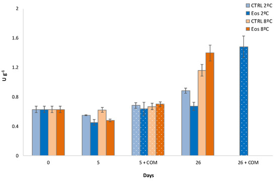 PPO is a major enzyme present in horticultural products, which causes enzymatic browning with the oxidation of polyphenols into quinones. Flat peach samples showed an initial PPO activity of 0.63 U g−1 (Figure 6). Storage temperature and storage time factors were significant for PPO activity (Table 1). Furthermore, all factor interactions were significant—including the packaging treatment×storage time interaction—for PPO activity. In particular, the highest PPO increments were observed after 26 days at 8 and 2 °C with 85 and 40% higher PPO activity values in CTRL samples compared to EO samples, respectively. As expected, enzymatic activity was higher at higher storage temperature, showing inhibited activity with EO release from active paper sheets. As previously mentioned, competitive inhibition of EOs within the active PPO sites has been demonstrated [11]. Although such studies of the effects of EOs on PPO activity (and other quality-degrading enzymes) are still scarce, the inhibitory effect of clove EO and eugenol has been recently observed in water chestnut and fresh-cut lettuce [11,49]. Nevertheless, our data showed that PPO activity was 20% higher in EO samples compared to CTRL after 26 days at 8 °C. Such behavior may be explained by two hypotheses: (1) the higher enzymatic substrate content (total phenolic content) of EO samples at 8 °C in the previous sampling time led to this enhanced enzymatic activity; (2) more intense tissue deterioration (due to the higher storage temperature or EO-mediated cell damage), leading to changes in membrane permeability and interaction between phenols and PPO (generally found in separate compartments in the cell).