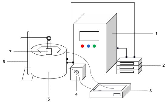 Divergent tri-frequency ultrasound equipment (Note: 1. Control panel, 2. Ultrasonic generator, 3. Constant temperature water bath pot, 4. Peristaltic pump, 5. Reactor, 6. Iron rack table, 7. Potato protein solution).