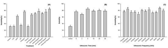 Effects of a combination of different modification methods (A) of mild thermal process (T40), ultrasound (US: TU20/28/40 kHz) and pH shift (pHS), ultrasonic time (B) and ultrasonic frequency (C) on the solubility of potato protein. (TU: triple-frequency, DU: dual-frequency, MFU: mono-frequency ultrasounds). Means with different letters (a–g) differ significantly (p < 0.05).