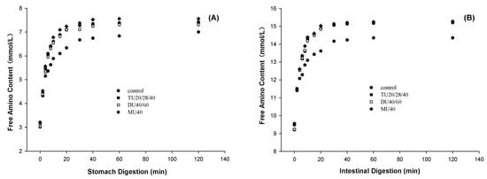 The digestibility of protein was characterized by measuring the content of free amino groups during a simulated gastrointestinal digestion. The effect of online US/T40/pHS treatment on the release of free amino groups from potato protein during gastric and intestinal digestion is shown in Figure 3A,B, respectively. The first-order kinetic equation (Equation (2)) was used to fit the curves to describe the free amino acid release during digestion. The content of the final free amino group released A and digestion rate constant K are shown in Table 1. During gastric digestion, compared with the control, the A values of TU20/28/40, DU40/60, and MU40 kHz increased by 12.1%, 10.9%, and 14.1% (p < 0.05), while the K value increased by 20.0%, 24.4%, and 16.0% (p < 0.05), respectively. The results of intestinal digestion were similar to those of gastric digestion. During intestinal digestion, compared with the control, the A values of TU20/28/40, DU40/60, and MU40 kHz increased by 16.6%, 19.2%, and 19.2% (p < 0.05), respectively, while the K value increased by 25.8%, 30.8%, and 30.8% (p < 0.05), respectively. These results showed that online US/T40/pHS treatment improved the digestibility rate and digestibility of potato protein. There were no significant differences in protein digestibility among TU20/28/40 kHz, DU40/60 kHz, and MU40 kHz.