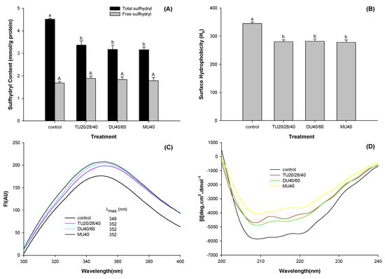 Effects of online-US/T40/pHS treatment at the frequency of TU20/28/40, DU40/60, and MU40 kHz on sulfhydryl content (A), surface hydrophobicity (B), intrinsic fluorescence (C), and circular dichroism (D) of potato protein. Means with different letters (a–b or A–B) differ significantly (p < 0.05).