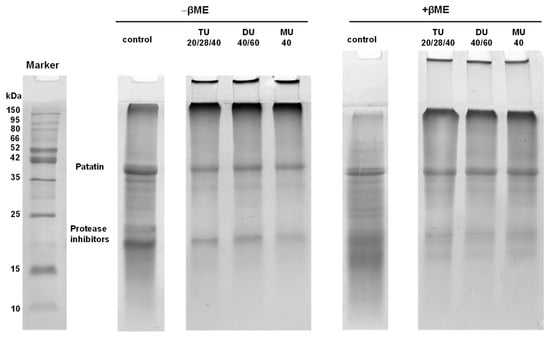 Reducing β-mercaptoethanol (+βME) and non-reducing (-βME) SDS-PAGE of potato protein treated with online-US/T40/pHS at the frequency of TU20/28/40, DU40/60, and MU40 kHz.