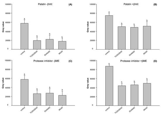 The band intensity of patatin (A,B) and protease inhibitor (C,D) of potato protein in reducing (+βME) and non-reducing (–βME) SDS-PAGE. Means with different letters (a–b) differ significantly (p < 0.05).