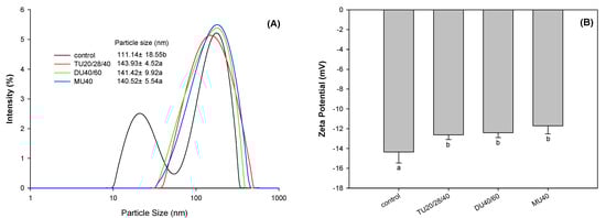 Effects of online-US/T40/pHS treatment at the frequency of TU20/28/40, DU40/60, and MU40 kHz on average particle size and particle size distribution (A) and zeta-potential (B) of potato protein. Means with different letters (a–b) differ significantly (p < 0.05).
