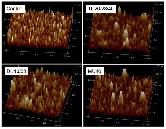 The aggregation of protein molecules induced by a physical or chemical modification can change the particle size of the protein particles. As shown in Figure 6A, the small peak at 10–50 nm disappeared, and the particle size distribution of potato protein indicated a right shift. Compared with the control, the average particle size of modified potato protein modified with TU20/28/40, DU40/60, and MU40 kHz increased by 29.5%, 27.2%, and 26.4% (p < 0.05), respectively. Furthermore, atomic force microscopy (AFM) was used to observe the morphology of potato protein treated with online US/T40/pHS. As displayed in Figure 8, potato protein without treatment was smaller than that with online US/T40/pHS treatment. This finding was consistent with the particle size results. Some large particles were displayed in the AFM images of the online US/T40/pHS-treated samples, which confirmed the SDS-PAGE results that indicated that large soluble protein aggregates in potato protein formed with online US/T40/pHS treatment. These aggregates might be due to the cavitation and mesothermal effects of ultrasound, as ultrasonic radiation promoted the unfolding of protein molecules under alkaline conditions. When the pH value was adjusted back to neutral, the proteins aggregated and eventually formed larger soluble aggregates.