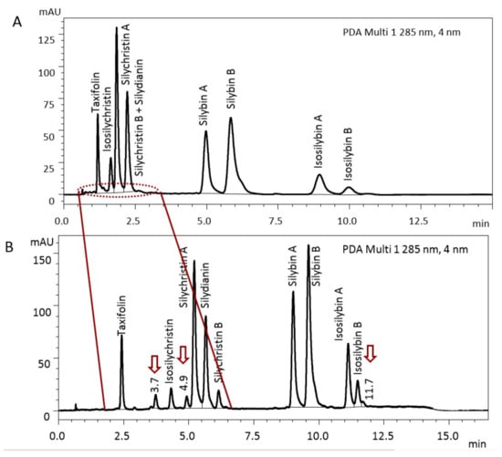 Comparison of the isocratic (A) and gradient (B) HPLC analytical method for silymarin SM 3. Chromolith RP-18e (100 × 3 mm) column; isocratic conditions: Mobile phase: 2% acetonitrile, 37% methanol, 0.1% formic acid, flow rate 1.1 mL/min, t = 25 °C; gradient conditions: Mobile phase: A = 5% acetonitrile, 0.1% formic acid; B = 80% methanol, 0.1% formic acid; gradient: 0 min 30% B, 12 min 60% B, 13 min 60% B, 14 min 30% B, 16.5 min stop, flow rate 1.1 mL/min, t = 25 °C. The arrows indicate compounds, which have not yet been identified.
